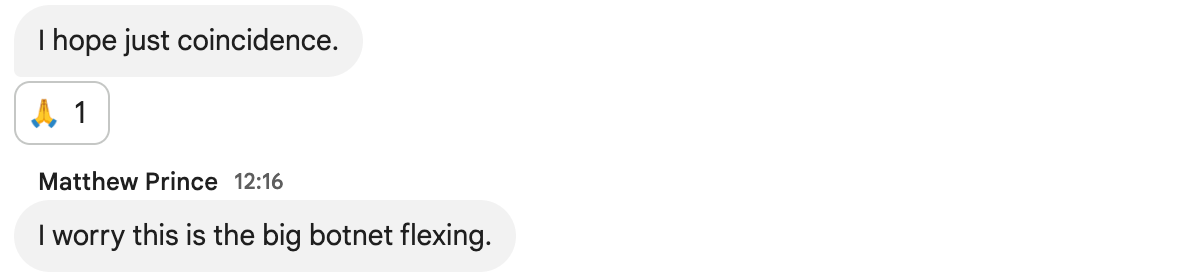 在内部事件聊天室中,我们担心这可能是近期一波高流量 Aisuru DDoS 攻击的延续: