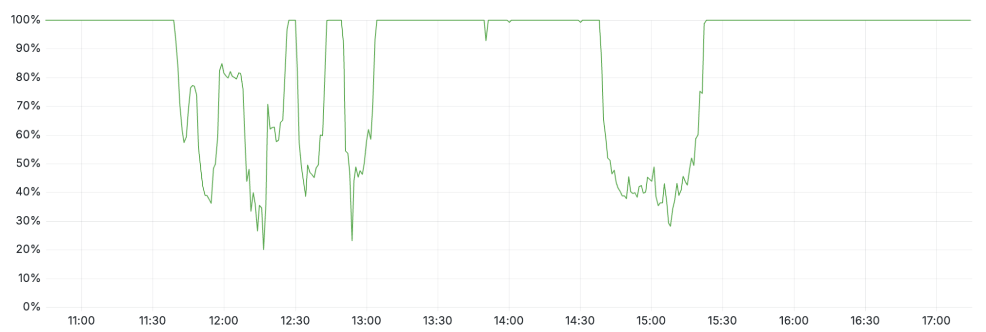 Turnstile 受到了本次服务中断的影响,导致没有建立活跃仪表板会话的客户无法登录。这表现为两个时段的服务可用性降低:一是 11:30 至 13:10,二是 14:40 至 15:30,如下图所示。