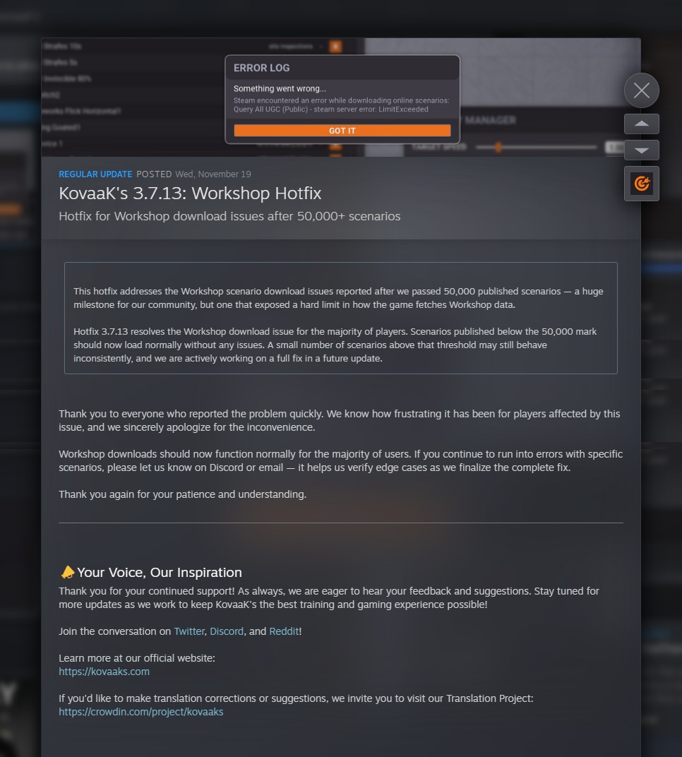 此热修复解决了在发布场景数量突破 50,000 个后玩家反馈的创意工坊场景下载问题——这对于我们的社区来说是一个重要的里程碑,但也暴露了游戏在获取创意工坊数据方面存在一个硬性限制。
